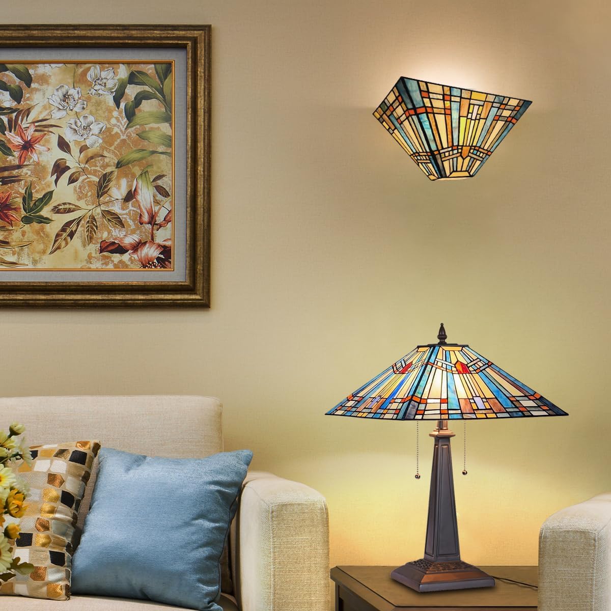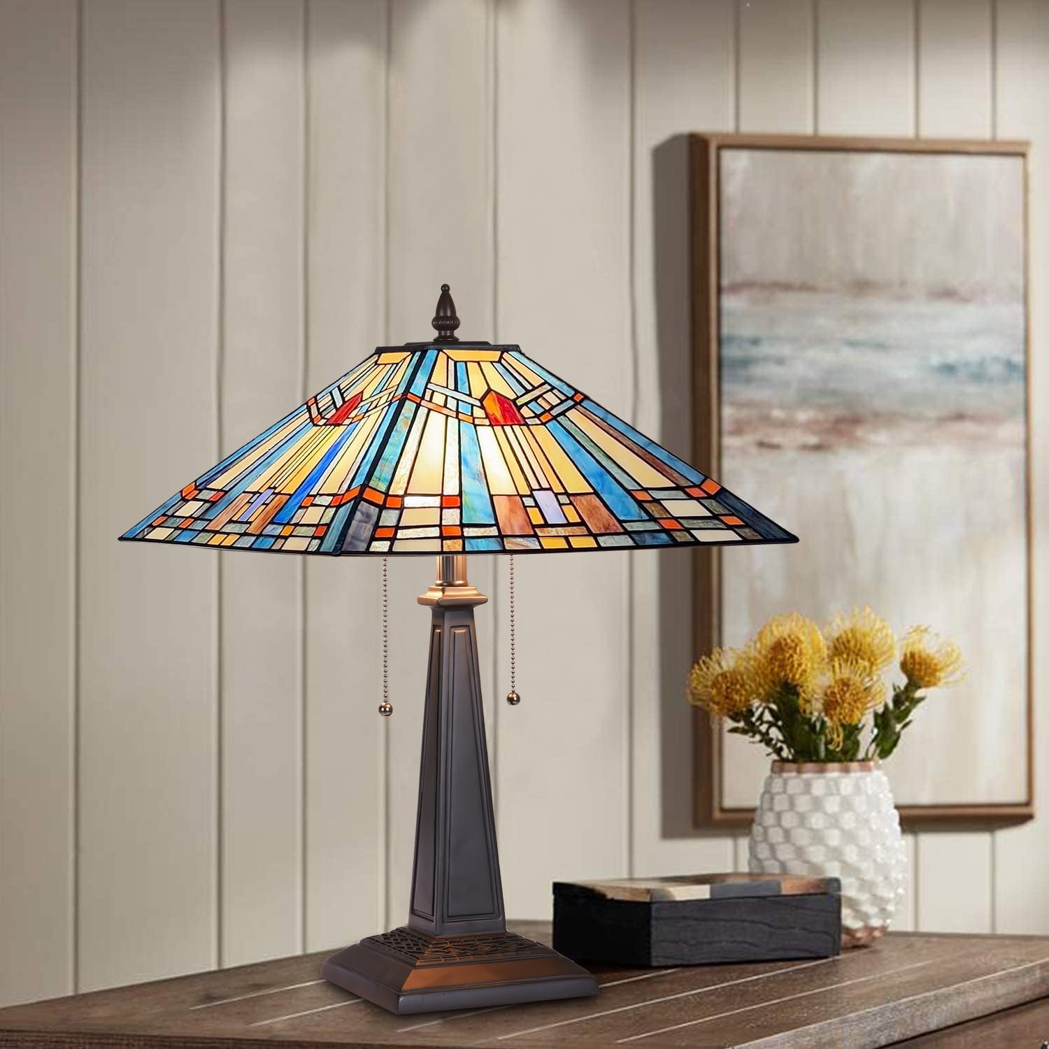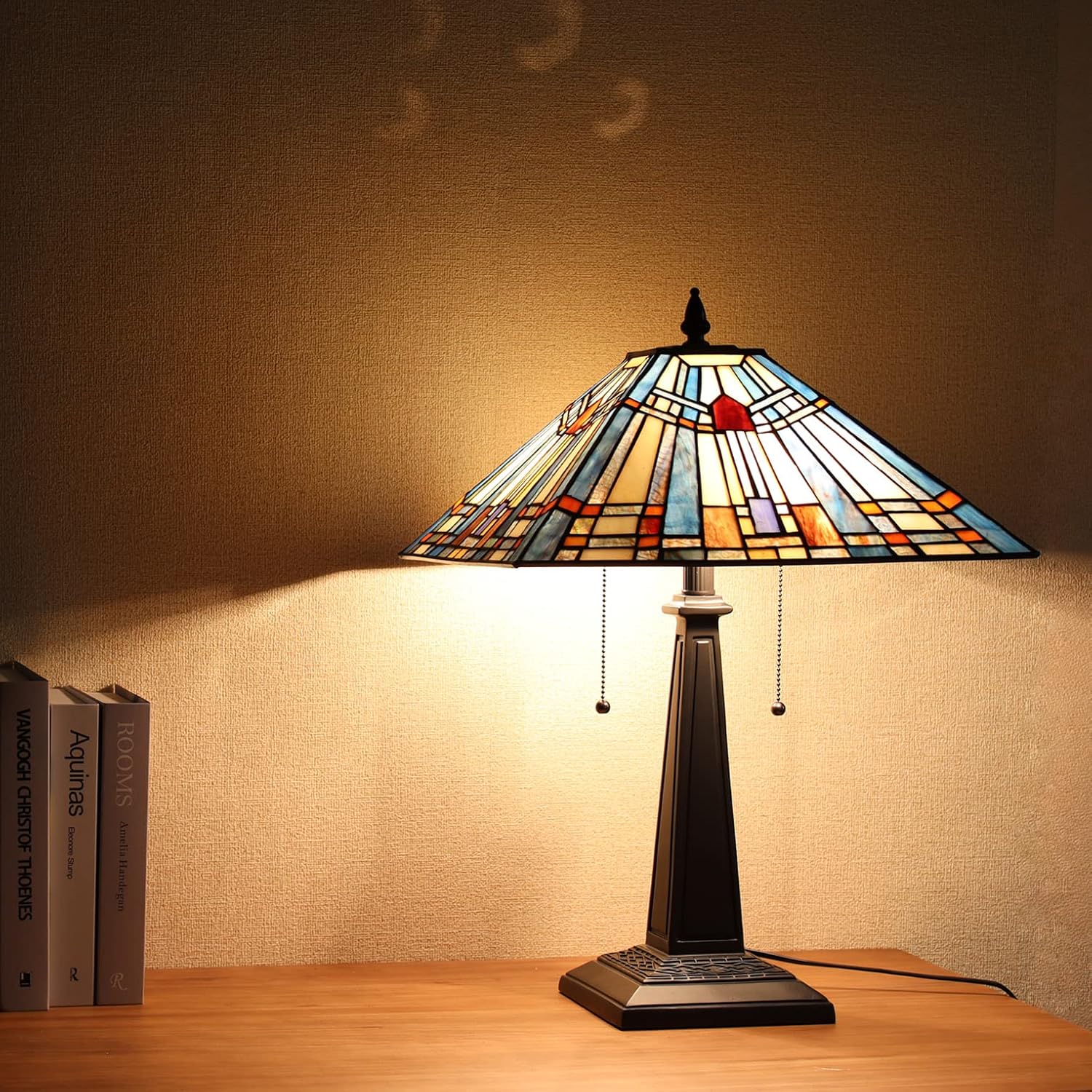 - 【Definitely Eye-Catching Antique Living Room Lamp】 Mission style blue tiffany lamp shade shines the light through the glass and creates beautiful patterns. All of the colors are vibrant and evenly toned when light on, it gives off a muted and soft light. Absolutely will look stunning in your room and be the focal point of adding a touch of elegance for home and office.